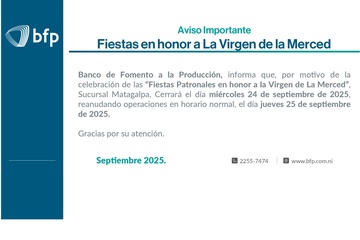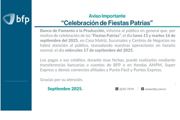 ¡Somos Banco de Fomento a la Producción (BFP), una institución financiera de Primer y Segundo Piso que impulsa el progreso de la Nación para alcanzar mayor crecimiento socioeconómico y alto nivel de competitividad de Nicaragua.